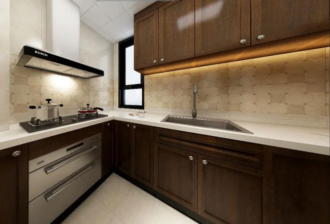 温润的木材质感也延续到厨房、卧室等极具烟火气与浪漫气息的空间设计之中。厨房L型的布局充分利用好拐角区域,不仅拥有大面积的木质柜体便于收纳,还将洗菜、切菜、烹饪等操作流程化,动线设计一目了然,使用更加便捷。