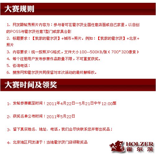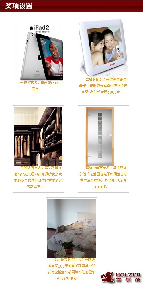 22日,霍尔茨掀起全国网络晒图浪潮,上传照片参与活动,即可有机会获得中国首发的苹果ipad2平板电脑,还有更多的神秘家居大奖、数码相框等你来拿!赶快行动吧,晒照片,得ipad2,用ipad2炫耀你的精彩生活!不要犹豫,2部ipad2必定有你…… 活动地址:http://home.soufun.com/zt/201104/huoercimumen.html