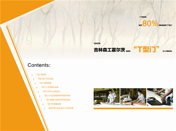 “宅以门户以冠带”,门自古至今就是家居装修中消费者所最为关注的重要一环,随着人们生活品质的提高,对保护私密及个人空间的逐渐看重,传统的门已经无法满足人们的需求,目前德国新型高科技门——T型门已成为人们选购的新宠。为此,为帮助消费者了解T型门相关知识,便于消费者决策,此次编写的《T型门消费指南》锁定了消费者最关心的问题,从T型门的诞生、中国T型门行业现状、T型门选购指南、T型门工艺流程及设备、T型门与平口门的对比、T型门门芯及饰面材料特性和优势、T型门静音三铰合页特性和优势、T型门的测量安装、选用T型门优点及木门日常护理十章节内容,通过图文并茂的形式向消费者们生动而全面的介绍了T型门的选购常识与技巧,希望消费者在选购与安装T型门的过程中能明明白白消费,踏踏实实消费,在安全舒心的居住环境下安居乐业。